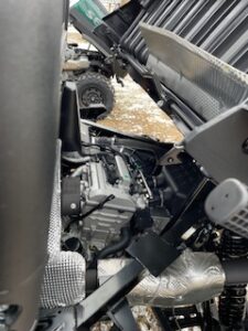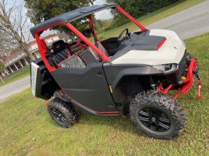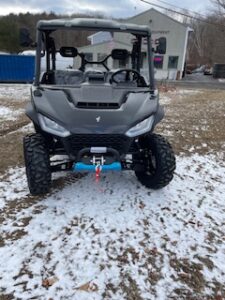 Seating for 6 with seat belts, under seat storage bin, roof, wireless winch, 30″ tires on premium aluminium wheels, 1000lb capacity dump bed, 2″ receiver with 2500lb capacity, touch screen, reverse camera, 2 year warranty and more. Powered by a 1000cc 105hp gas engine.